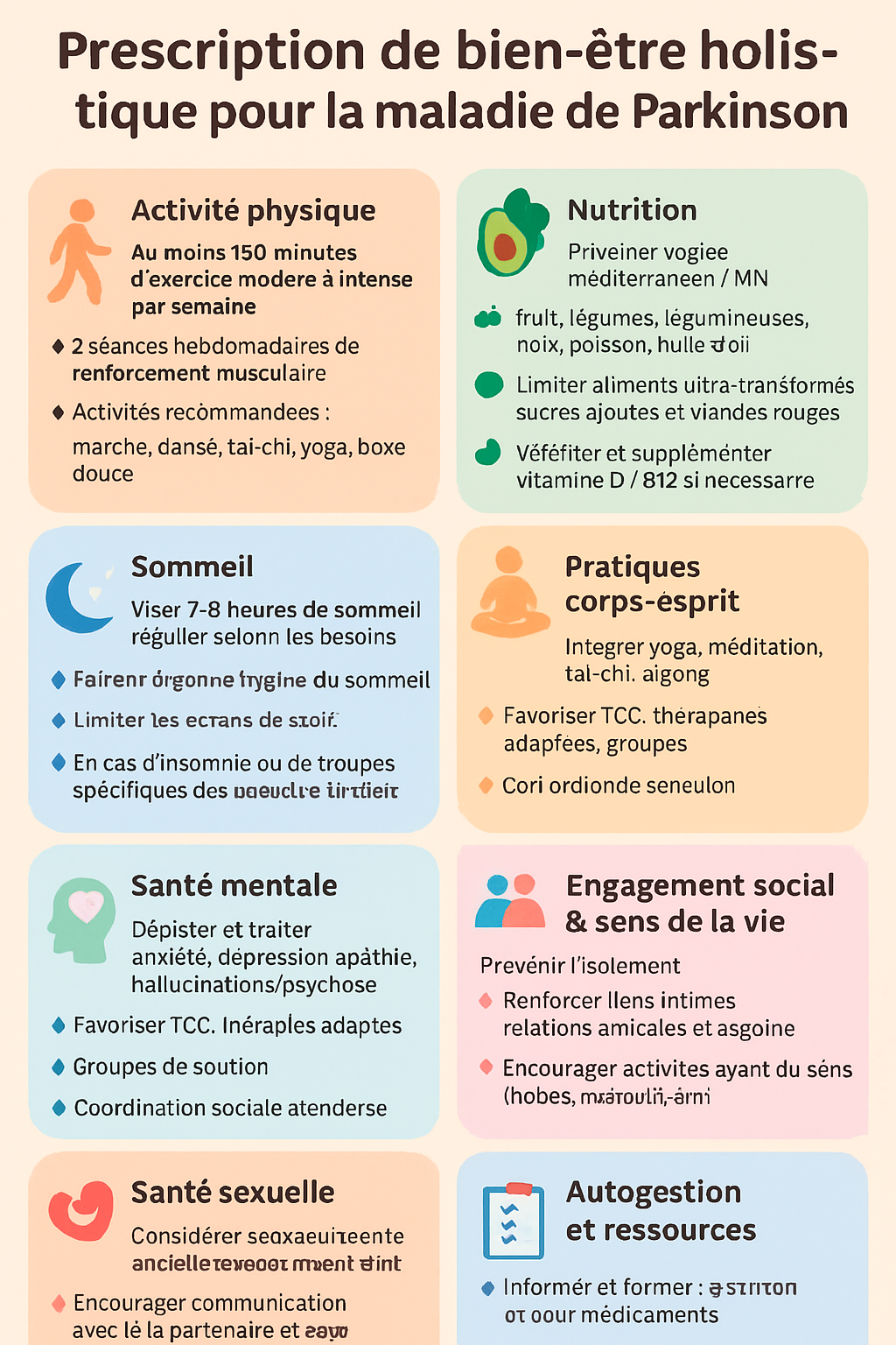 - Les approches comme l’Ayurveda (yoga, mucuna pruriens) et la médecine traditionnelle chinoise (acupuncture, tai chi, qigong) peuvent compléter la prise en charge, si intégrées avec respect et prudence scientifique.